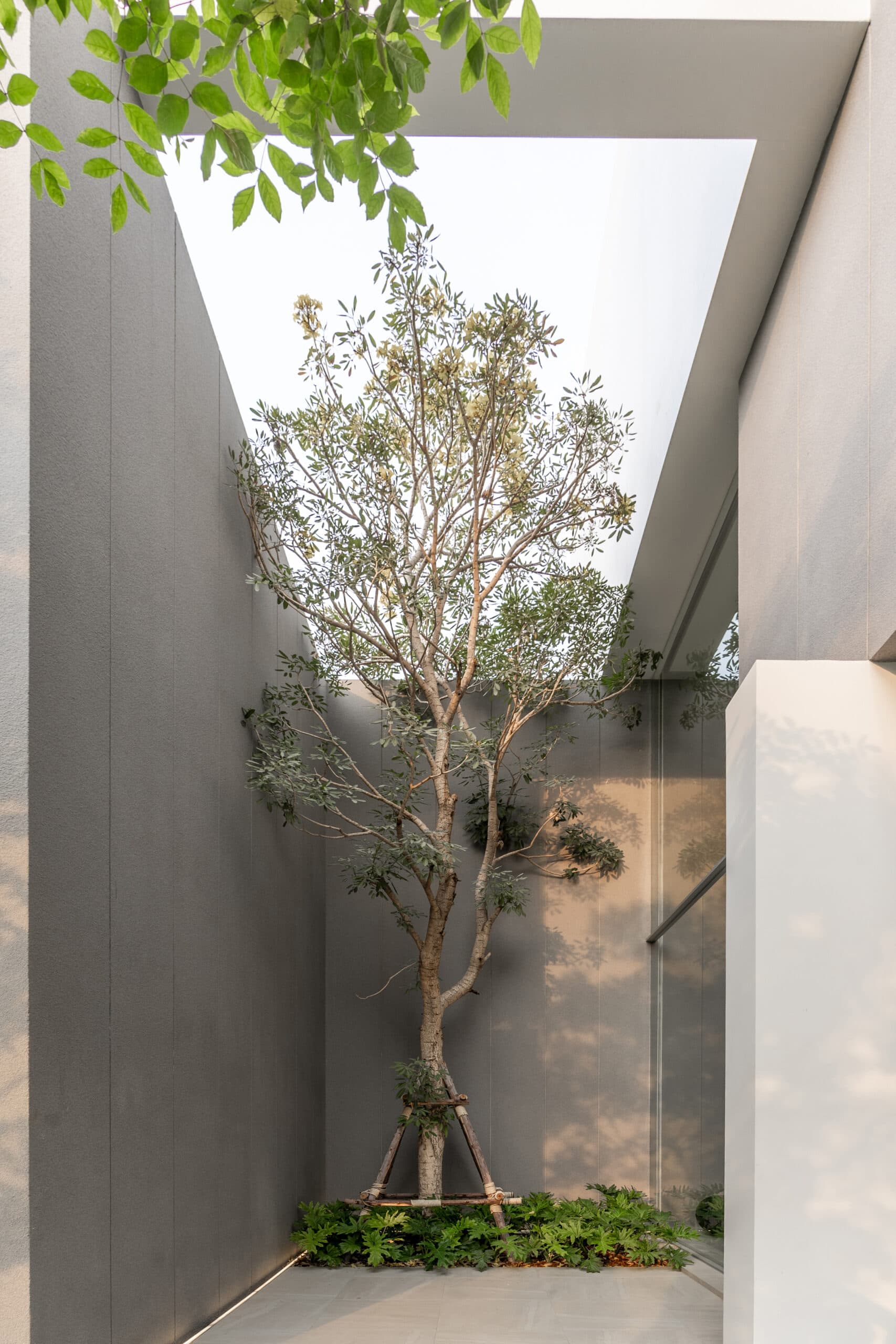 Mit Chit House is situated along the left side of the property, leaving room on the right for a large garden that serves to connect the original and new houses. On the ground floor, a large common area consisting of the living and dining rooms is designed as an Open plan to foster continuity from the front of the house to its back. The vertical space between the ground living room is also entirely open, connecting seamlessly with the second-floor den. This way, even distant family members still feel close. In keeping with the notion of togetherness, the den acts as an intersection between the old and new houses, allowing the parents of the family to easily make their way to their children. An open space of its own, the den also boasts great scenic views. Topping everything off is the third most private floor, comprised of the two siblings’ bedrooms complete with views of the property’s private gardens on either side.