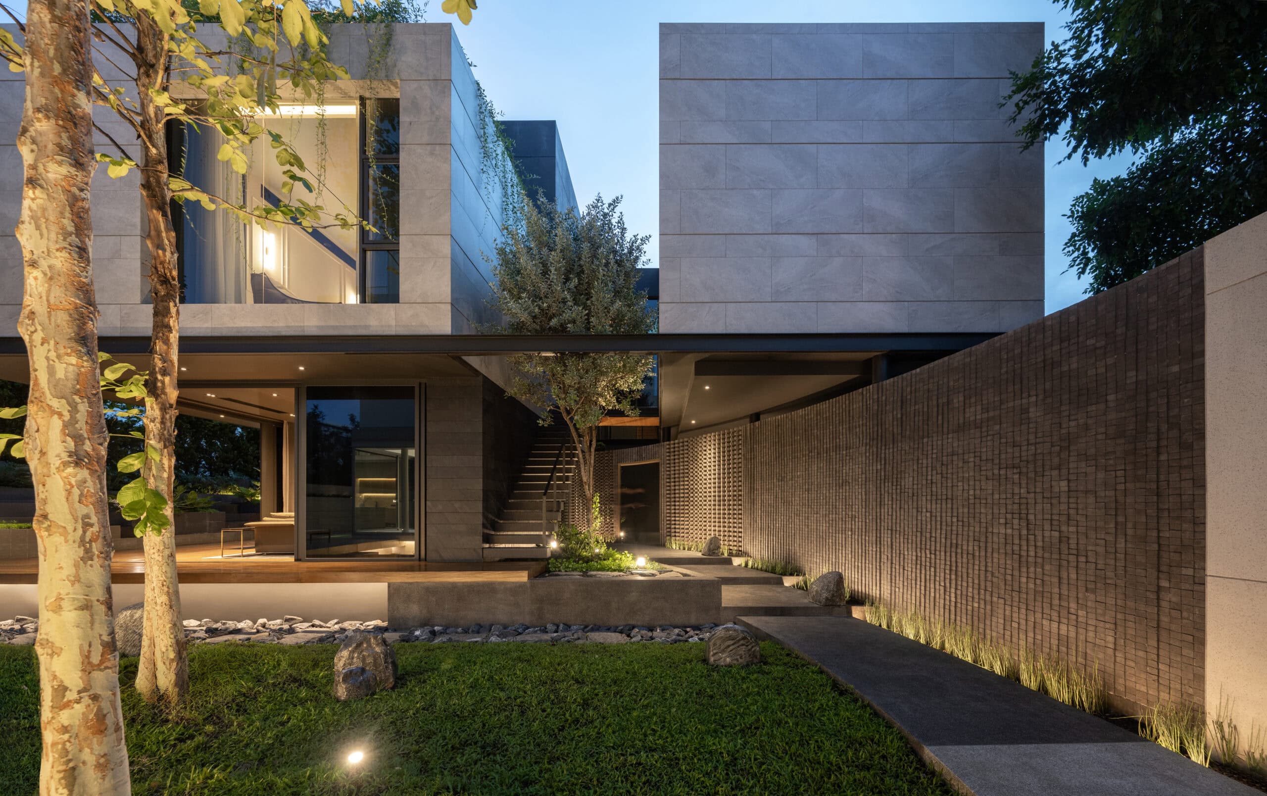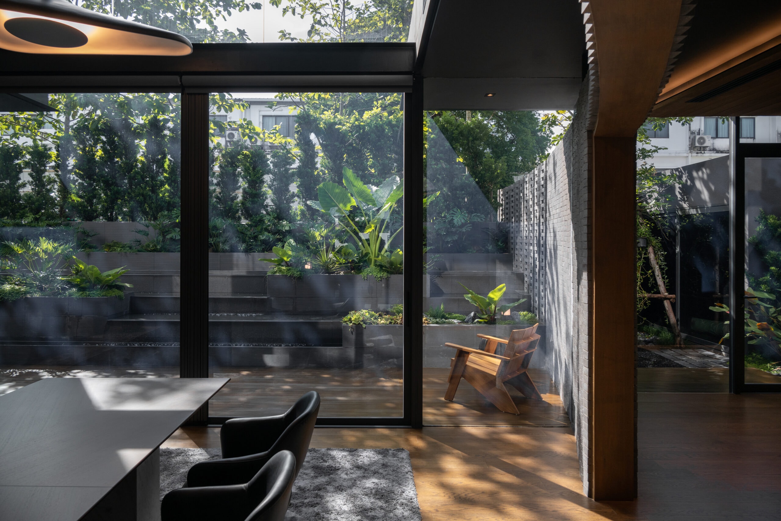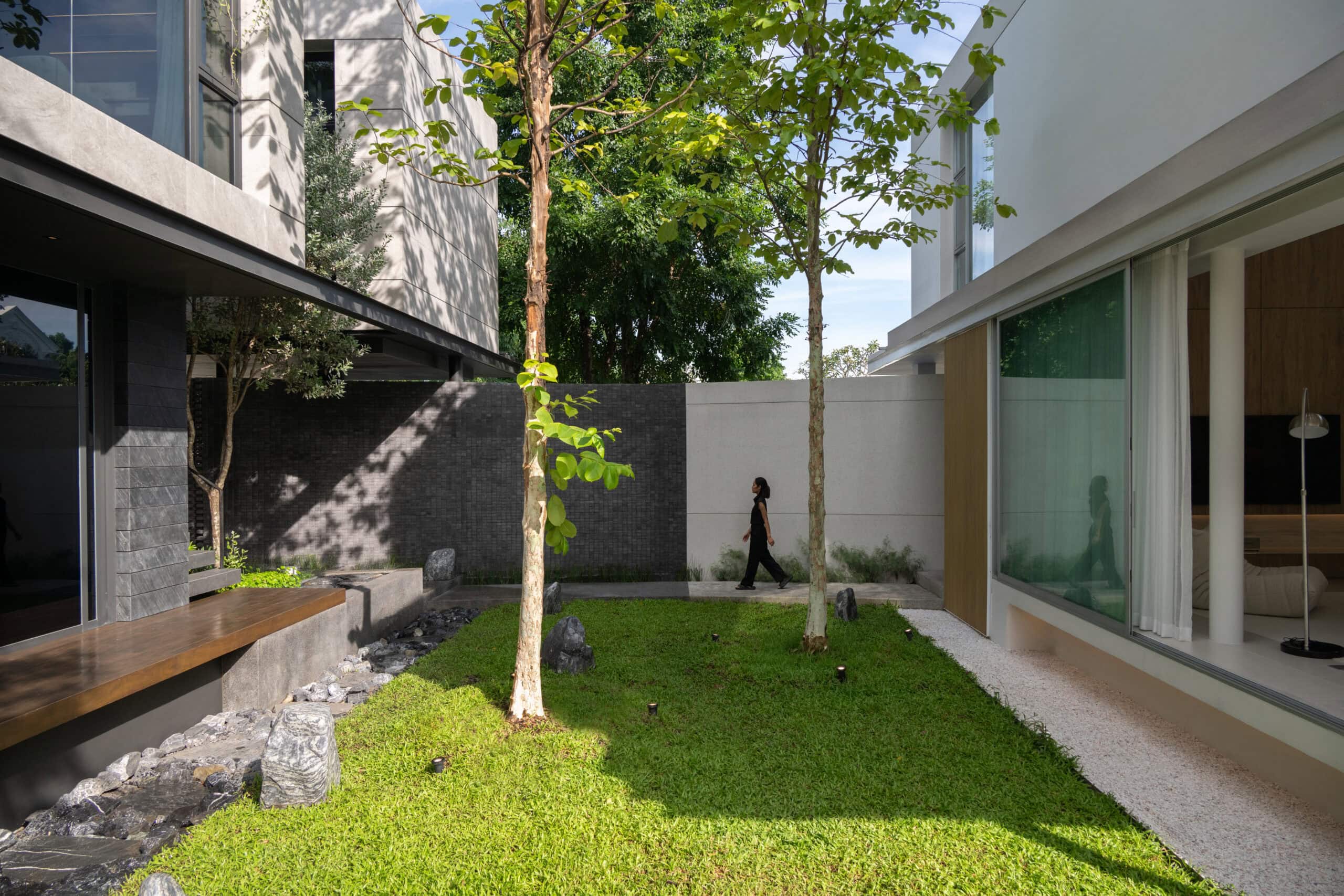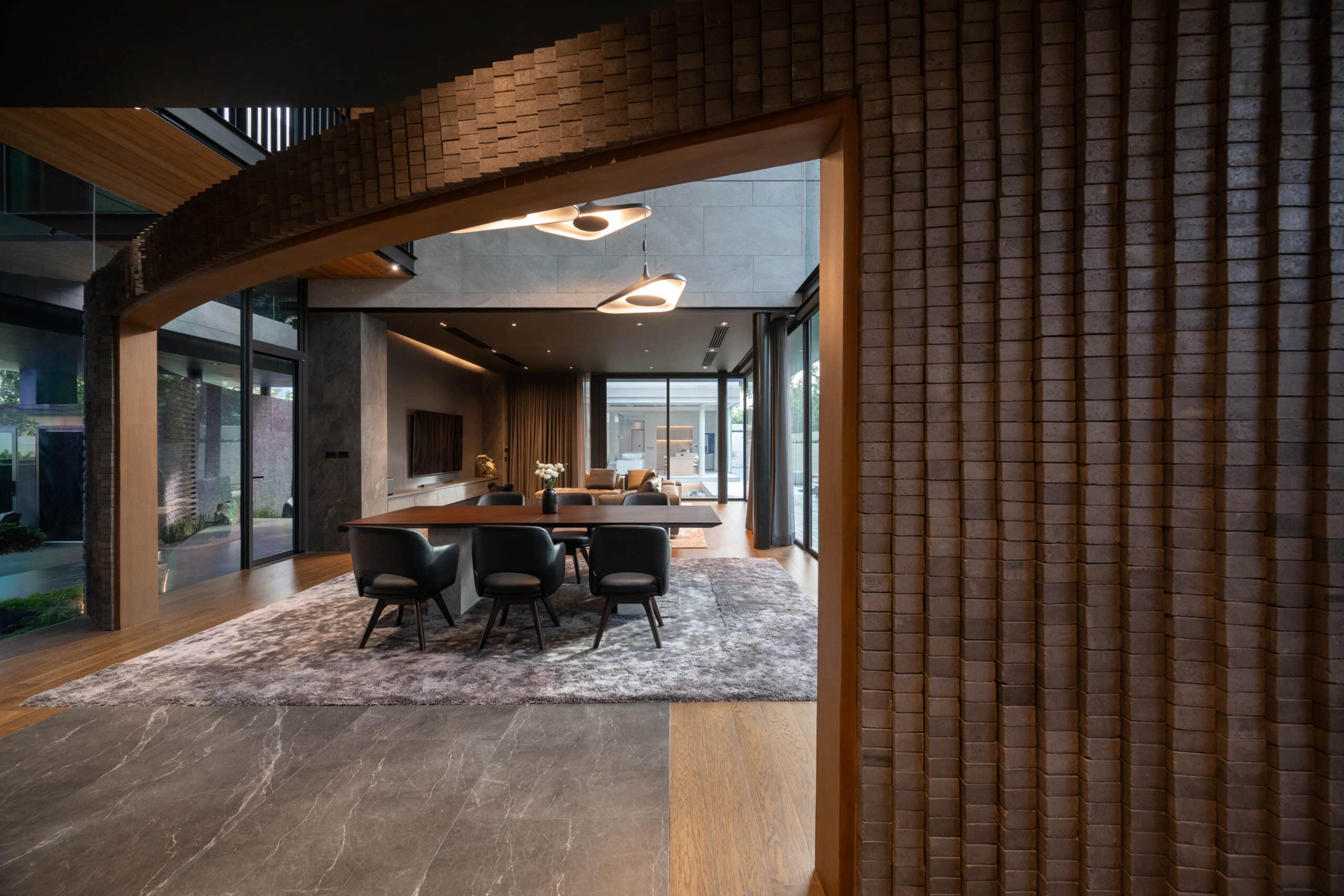 Cloud & Shadow House comprises two private residences for two related families, situated on a pair of adjacent square plots in Lat Phrao, Bangkok. The core challenge of the project was to create a living environment where the families could share a meaningful communal space, yet still preserve their individual privacy. Rather than treating the boundary between the two plots as a mere dividing line, the design team reinterpreted it as an architectural element—one capable of shaping relationships instead of severing them. The boundary wall was reimagined as a sweeping 16-meter-radius curve that stretches from one plot to the other. This curved line carves out a concave void that draws the two houses inward, transforming what would typically be unused side setbacks into a generous open-plan shared courtyard. This gesture allows the living rooms of both houses to open toward a broad external landscape—an uncommon experience in dense urban housing, where views are often blocked by blank walls only a few meters away.