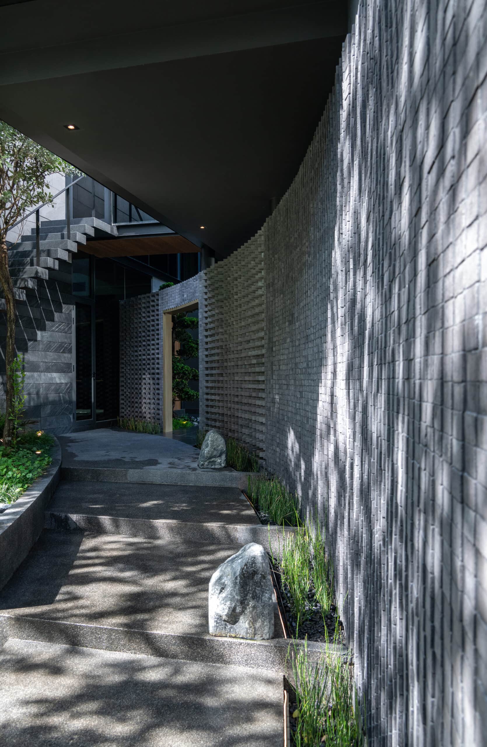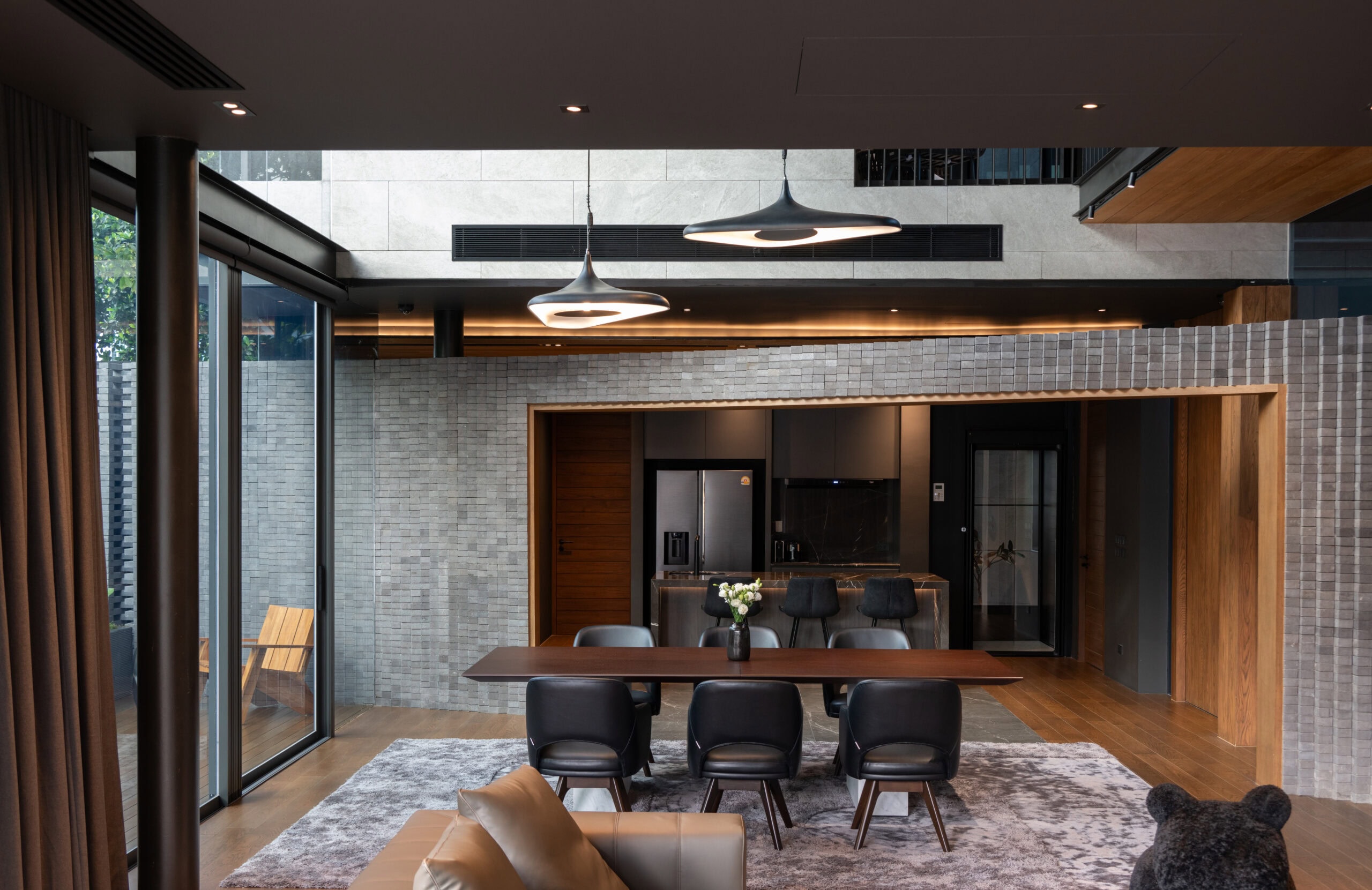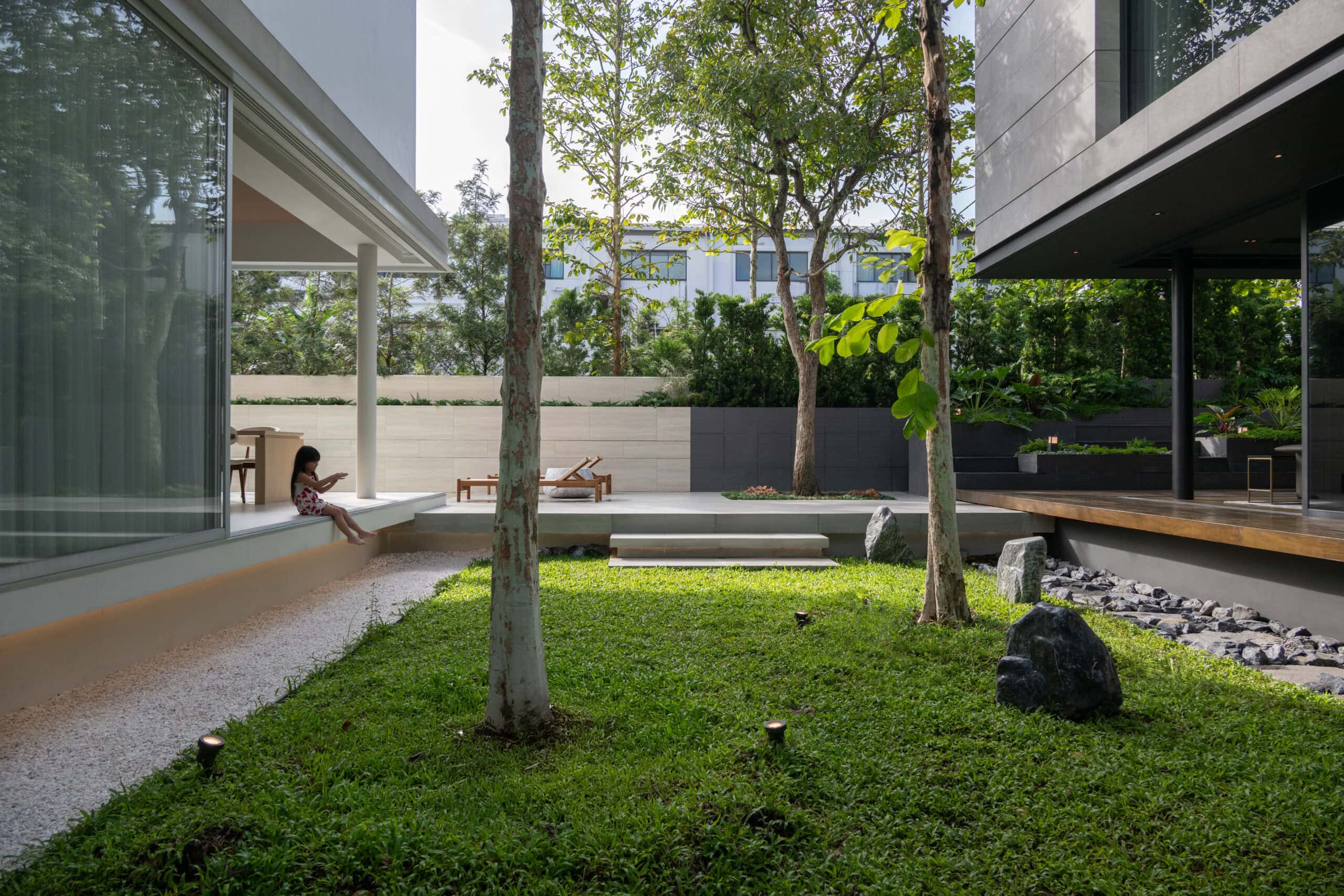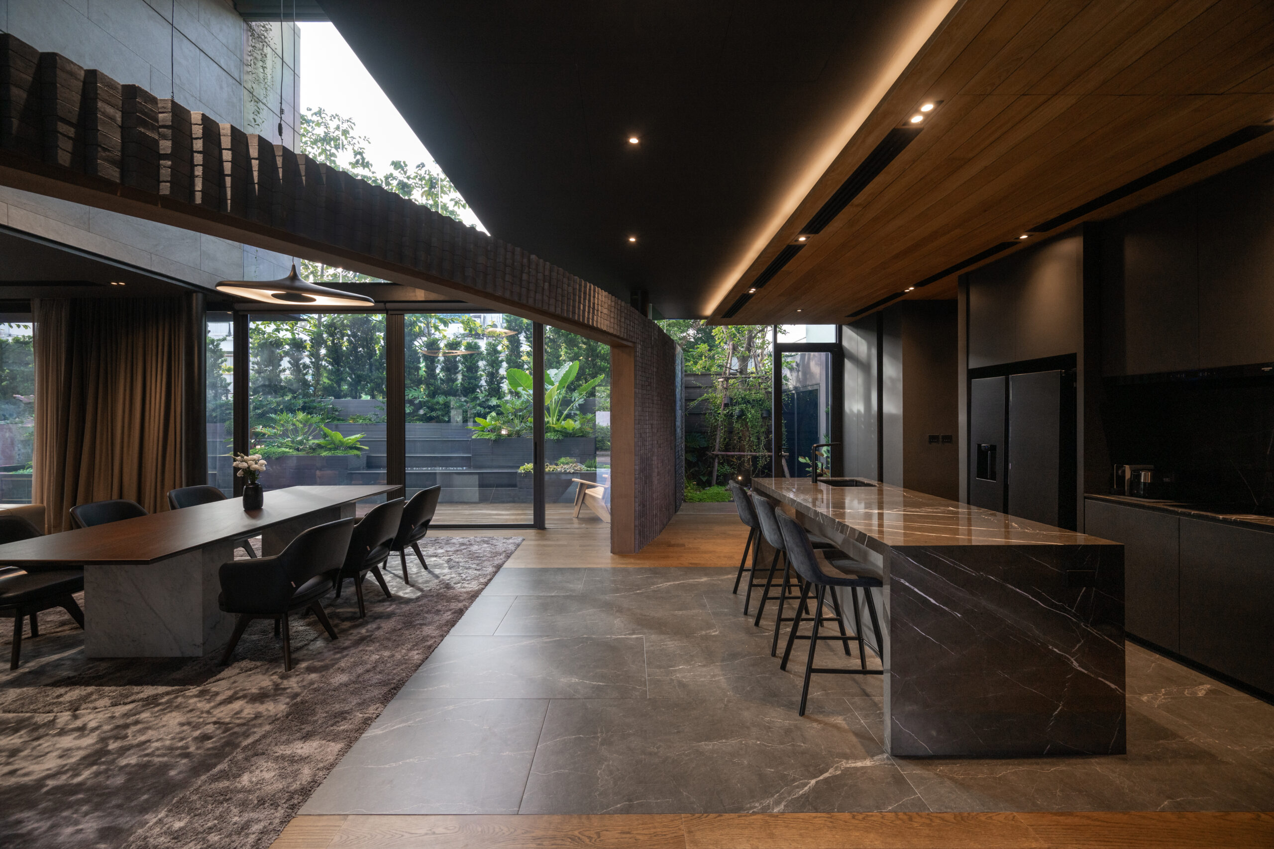 Cloud & Shadow House comprises two private residences for two related families, situated on a pair of adjacent square plots in Lat Phrao, Bangkok. The core challenge of the project was to create a living environment where the families could share a meaningful communal space, yet still preserve their individual privacy. Rather than treating the boundary between the two plots as a mere dividing line, the design team reinterpreted it as an architectural element—one capable of shaping relationships instead of severing them. The boundary wall was reimagined as a sweeping 16-meter-radius curve that stretches from one plot to the other. This curved line carves out a concave void that draws the two houses inward, transforming what would typically be unused side setbacks into a generous open-plan shared courtyard. This gesture allows the living rooms of both houses to open toward a broad external landscape—an uncommon experience in dense urban housing, where views are often blocked by blank walls only a few meters away.