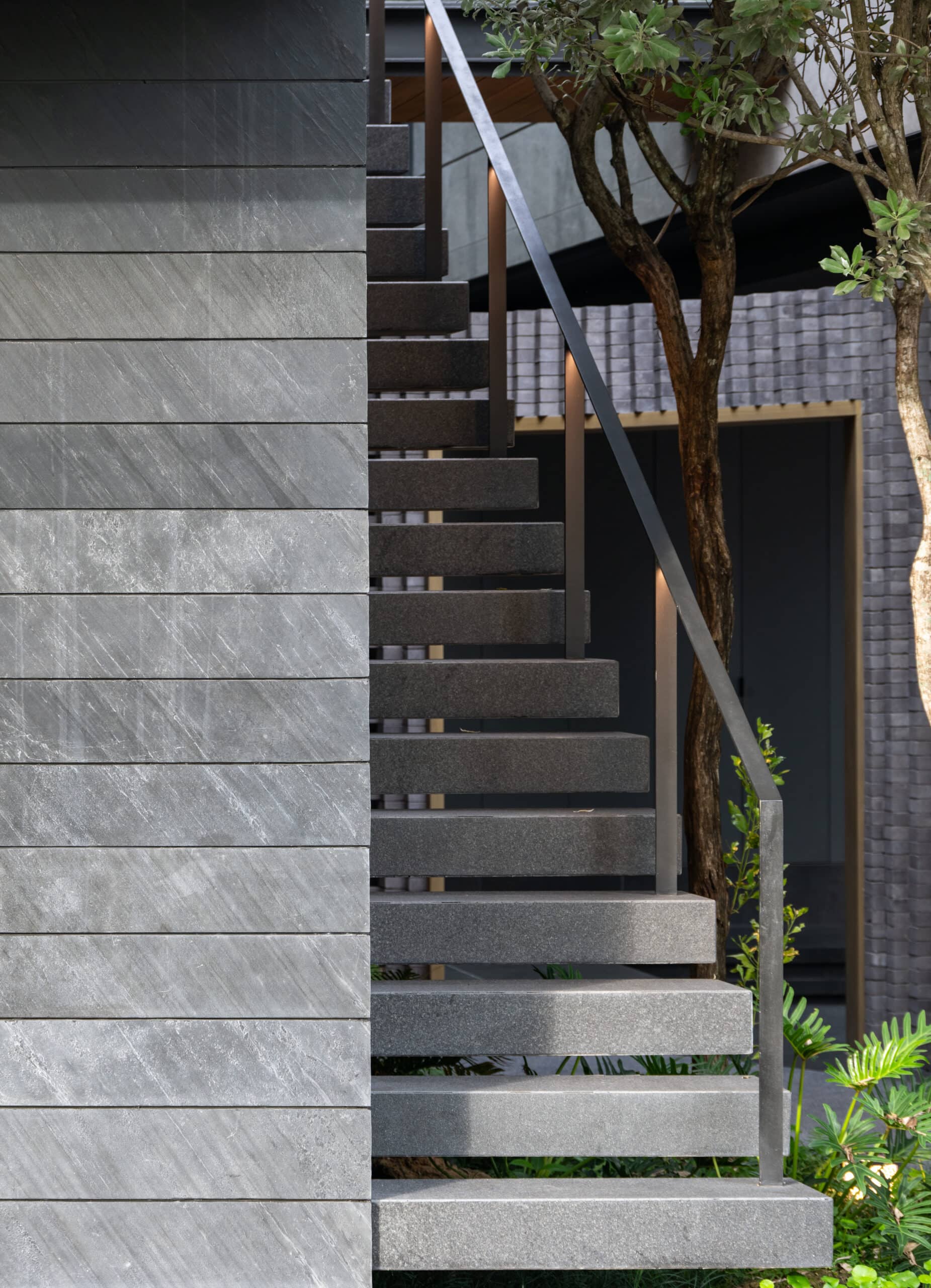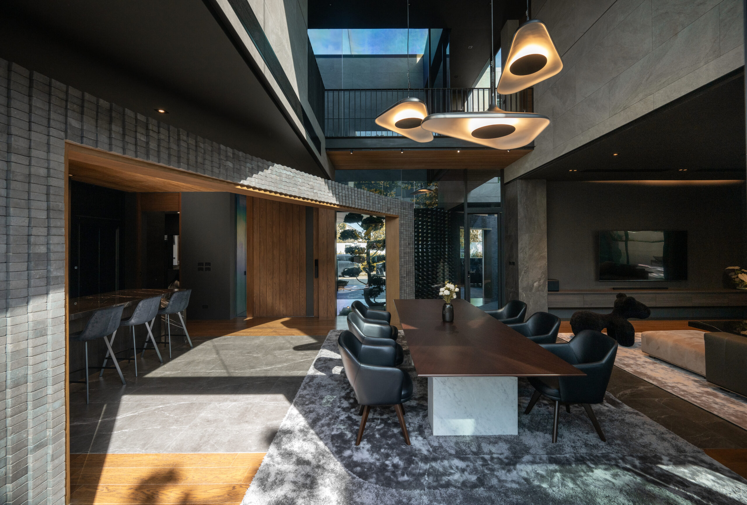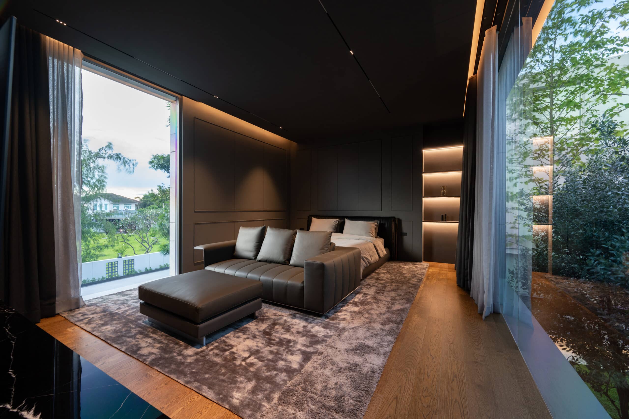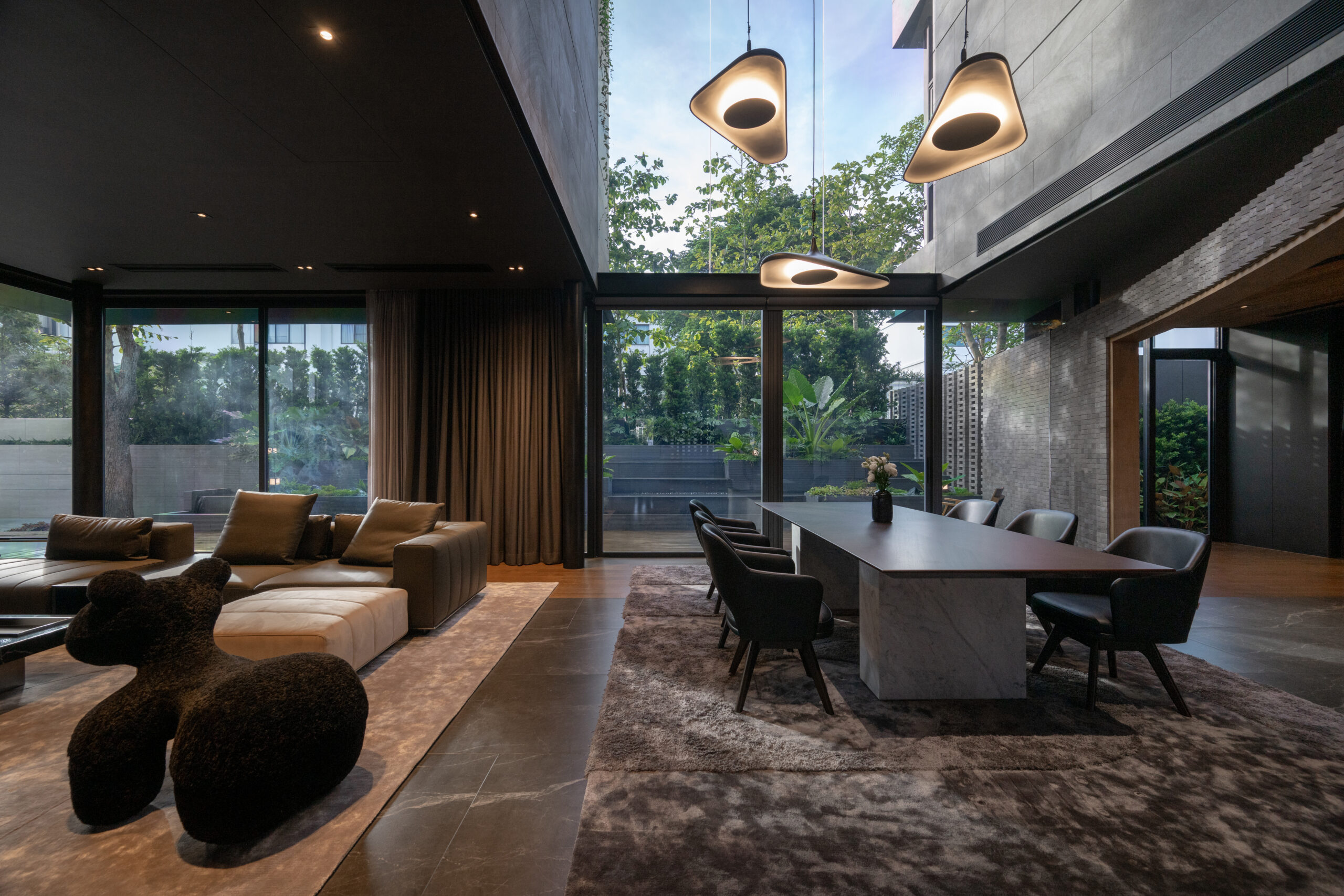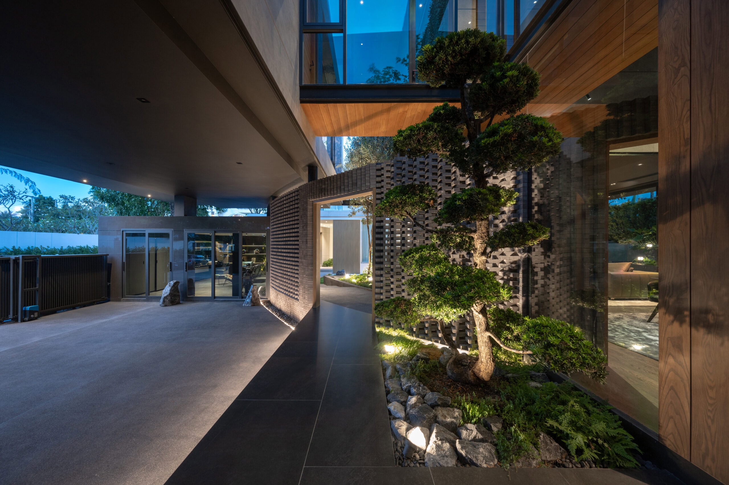 Cloud & Shadow House comprises two private residences for two related families, situated on a pair of adjacent square plots in Lat Phrao, Bangkok. The core challenge of the project was to create a living environment where the families could share a meaningful communal space, yet still preserve their individual privacy. Rather than treating the boundary between the two plots as a mere dividing line, the design team reinterpreted it as an architectural element—one capable of shaping relationships instead of severing them. The boundary wall was reimagined as a sweeping 16-meter-radius curve that stretches from one plot to the other. This curved line carves out a concave void that draws the two houses inward, transforming what would typically be unused side setbacks into a generous open-plan shared courtyard. This gesture allows the living rooms of both houses to open toward a broad external landscape—an uncommon experience in dense urban housing, where views are often blocked by blank walls only a few meters away.