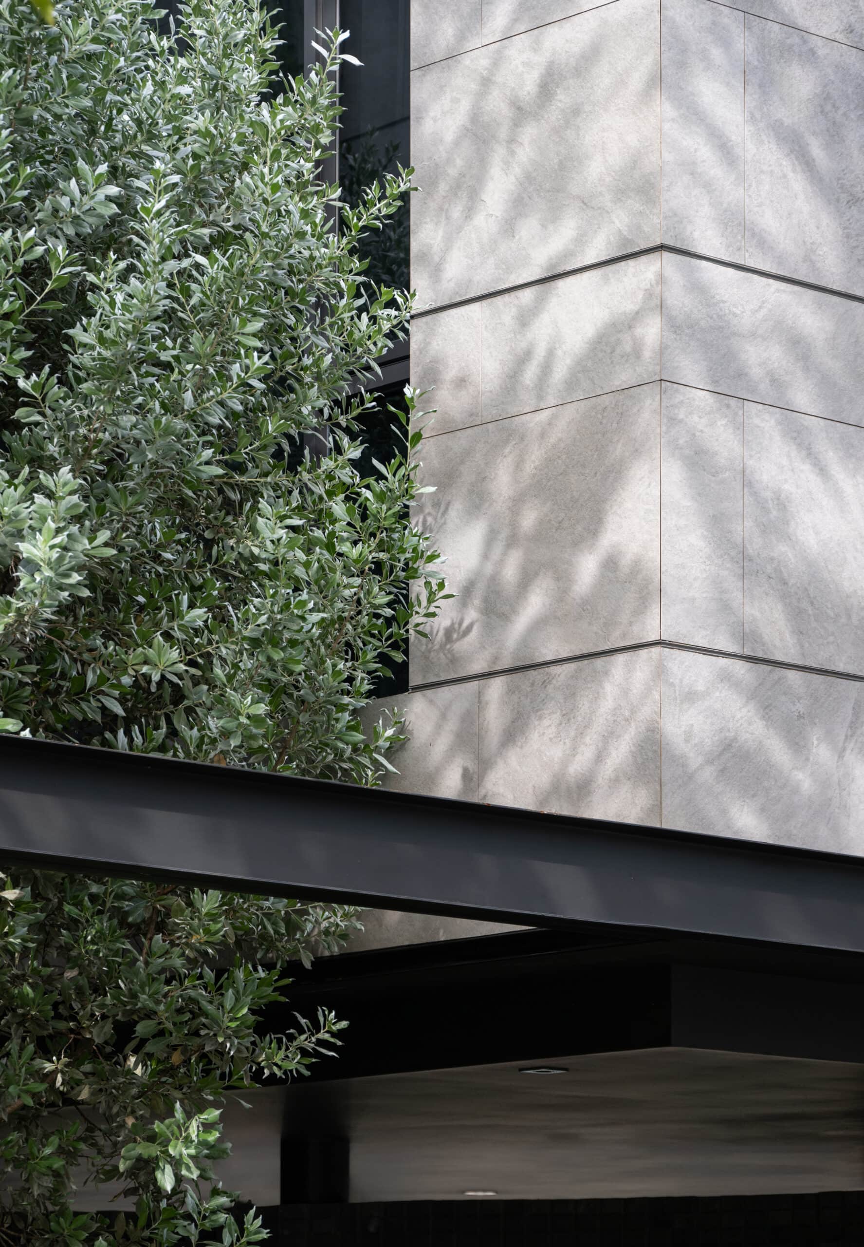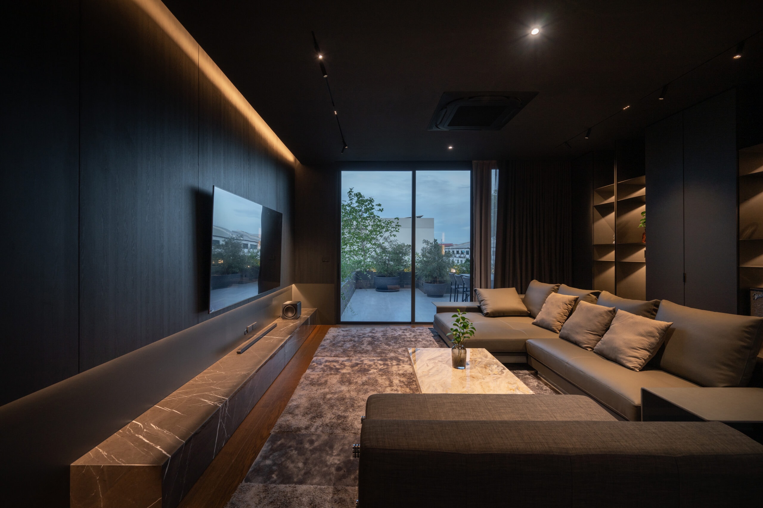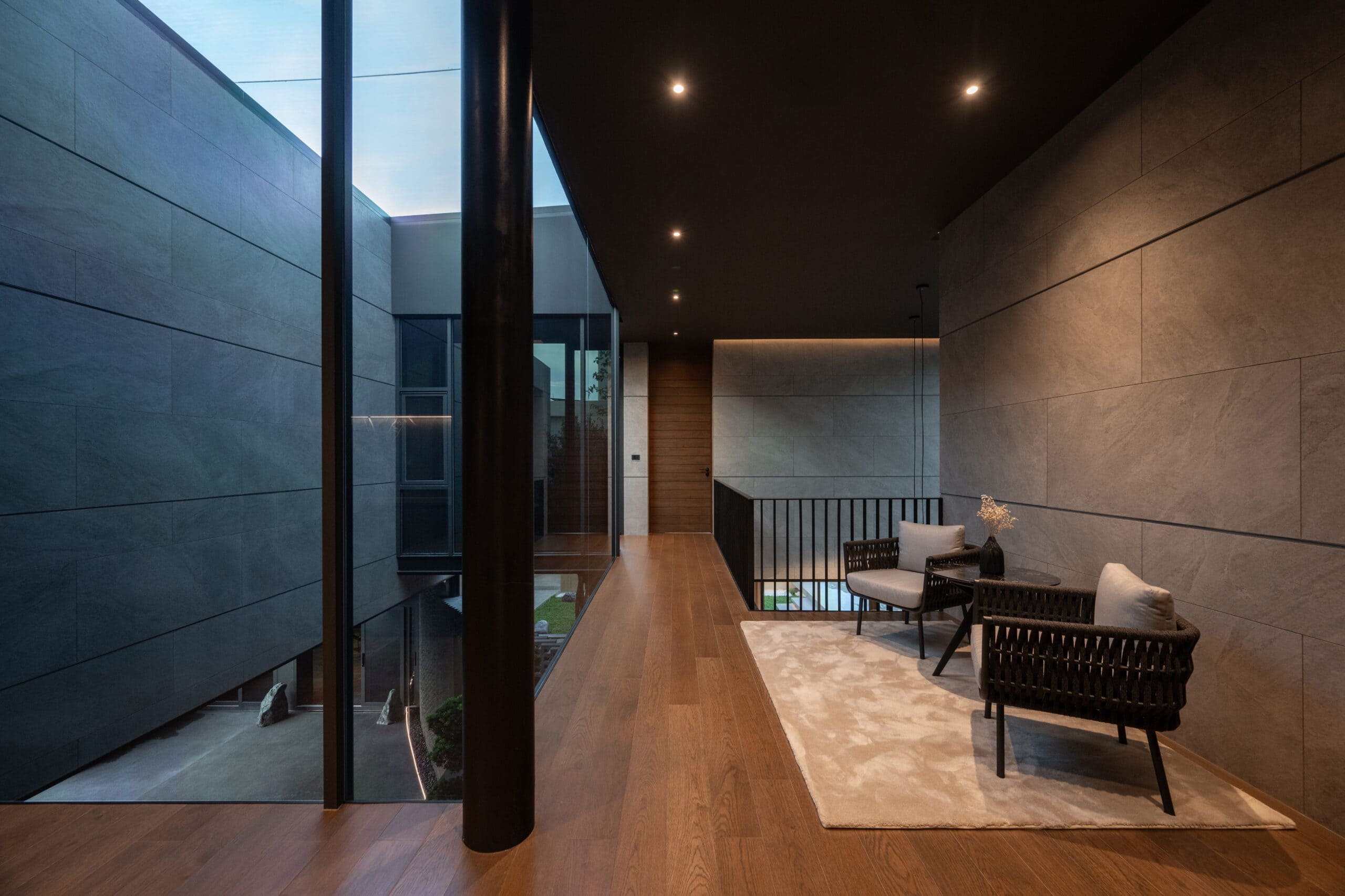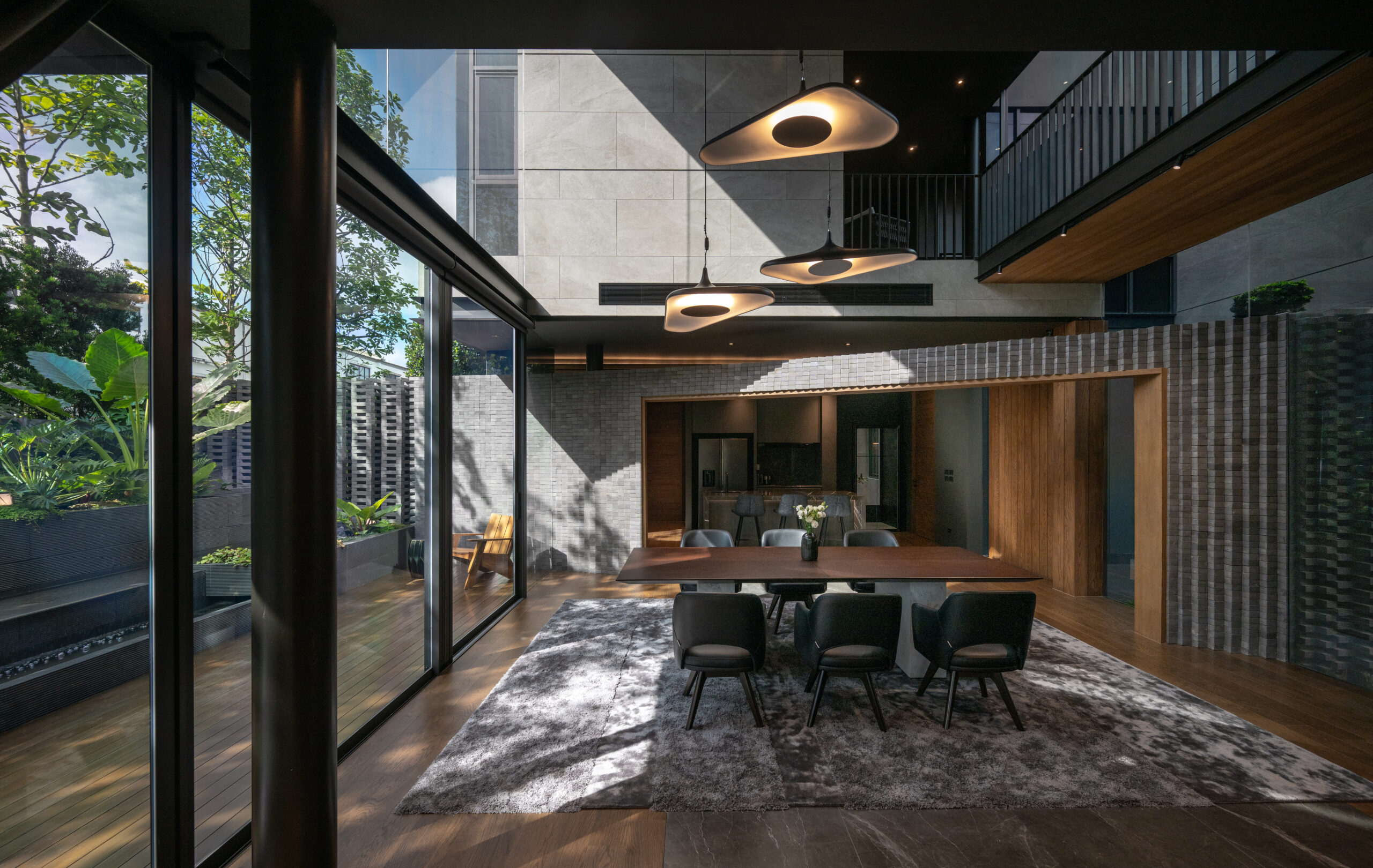 Cloud & Shadow House comprises two private residences for two related families, situated on a pair of adjacent square plots in Lat Phrao, Bangkok. The core challenge of the project was to create a living environment where the families could share a meaningful communal space, yet still preserve their individual privacy. Rather than treating the boundary between the two plots as a mere dividing line, the design team reinterpreted it as an architectural element—one capable of shaping relationships instead of severing them. The boundary wall was reimagined as a sweeping 16-meter-radius curve that stretches from one plot to the other. This curved line carves out a concave void that draws the two houses inward, transforming what would typically be unused side setbacks into a generous open-plan shared courtyard. This gesture allows the living rooms of both houses to open toward a broad external landscape—an uncommon experience in dense urban housing, where views are often blocked by blank walls only a few meters away.