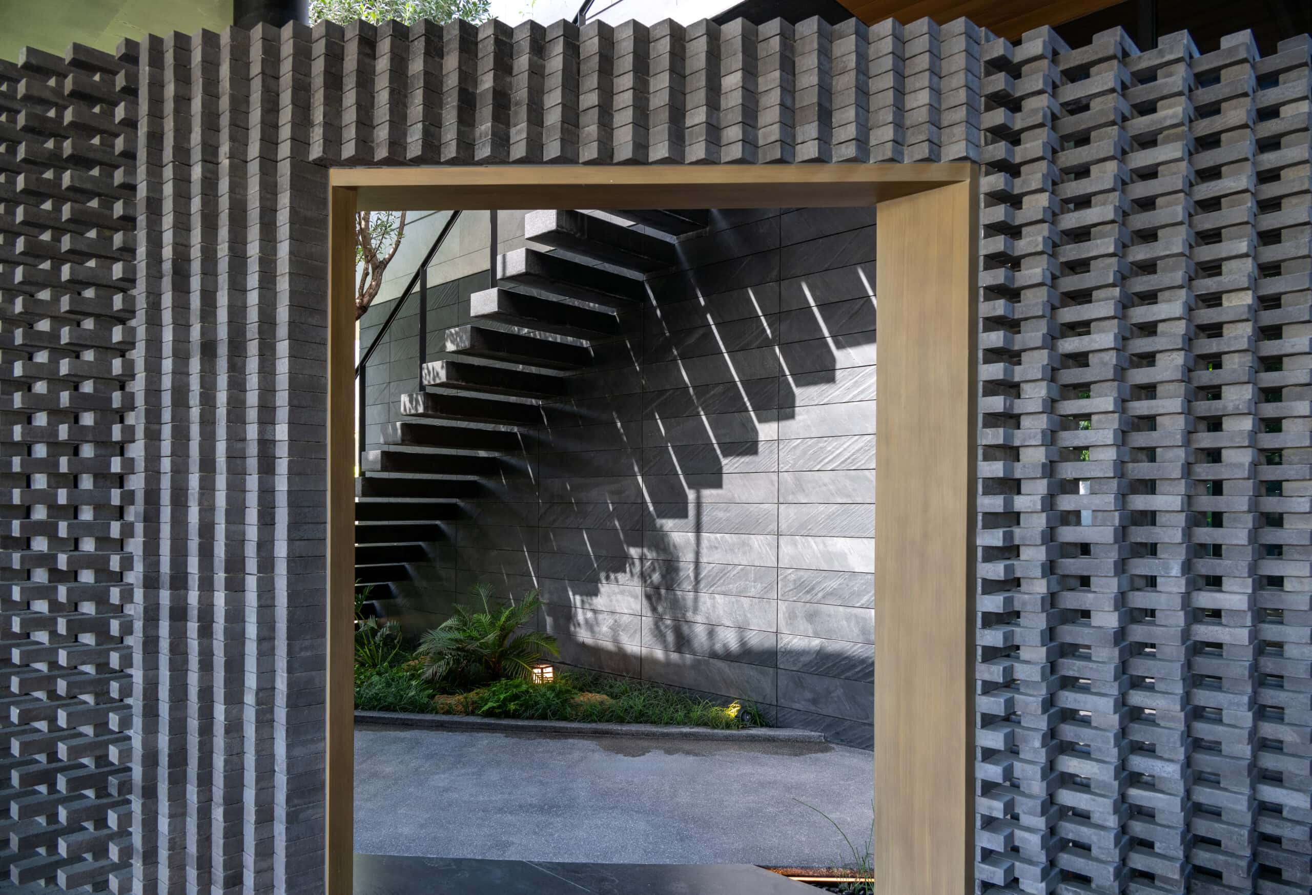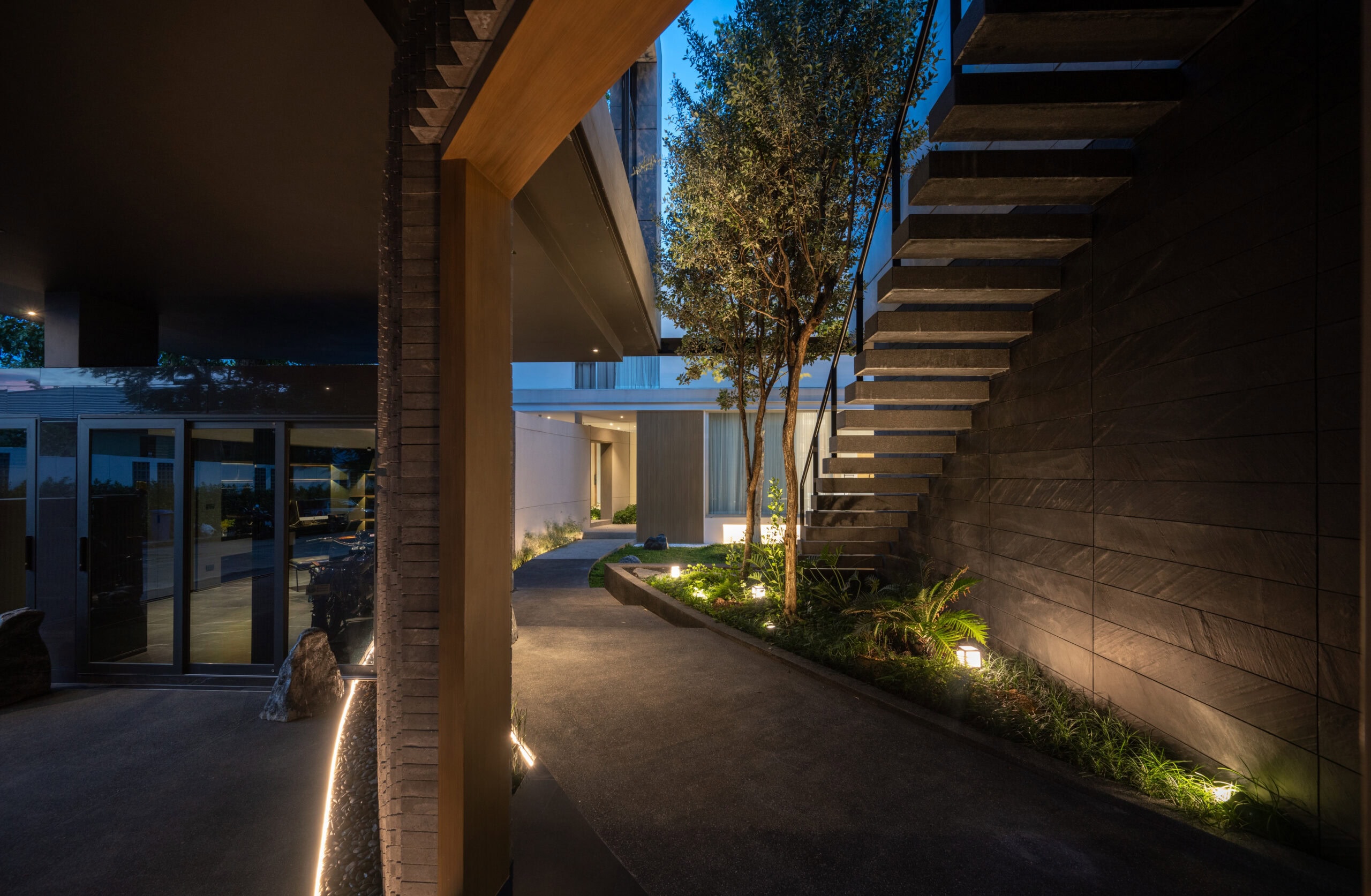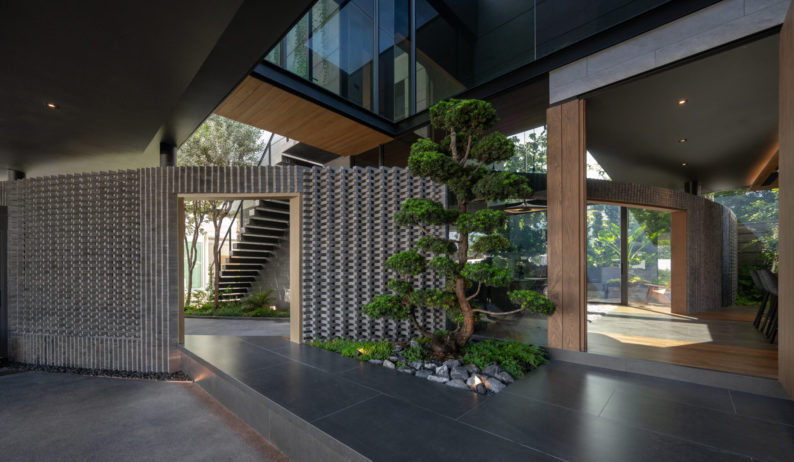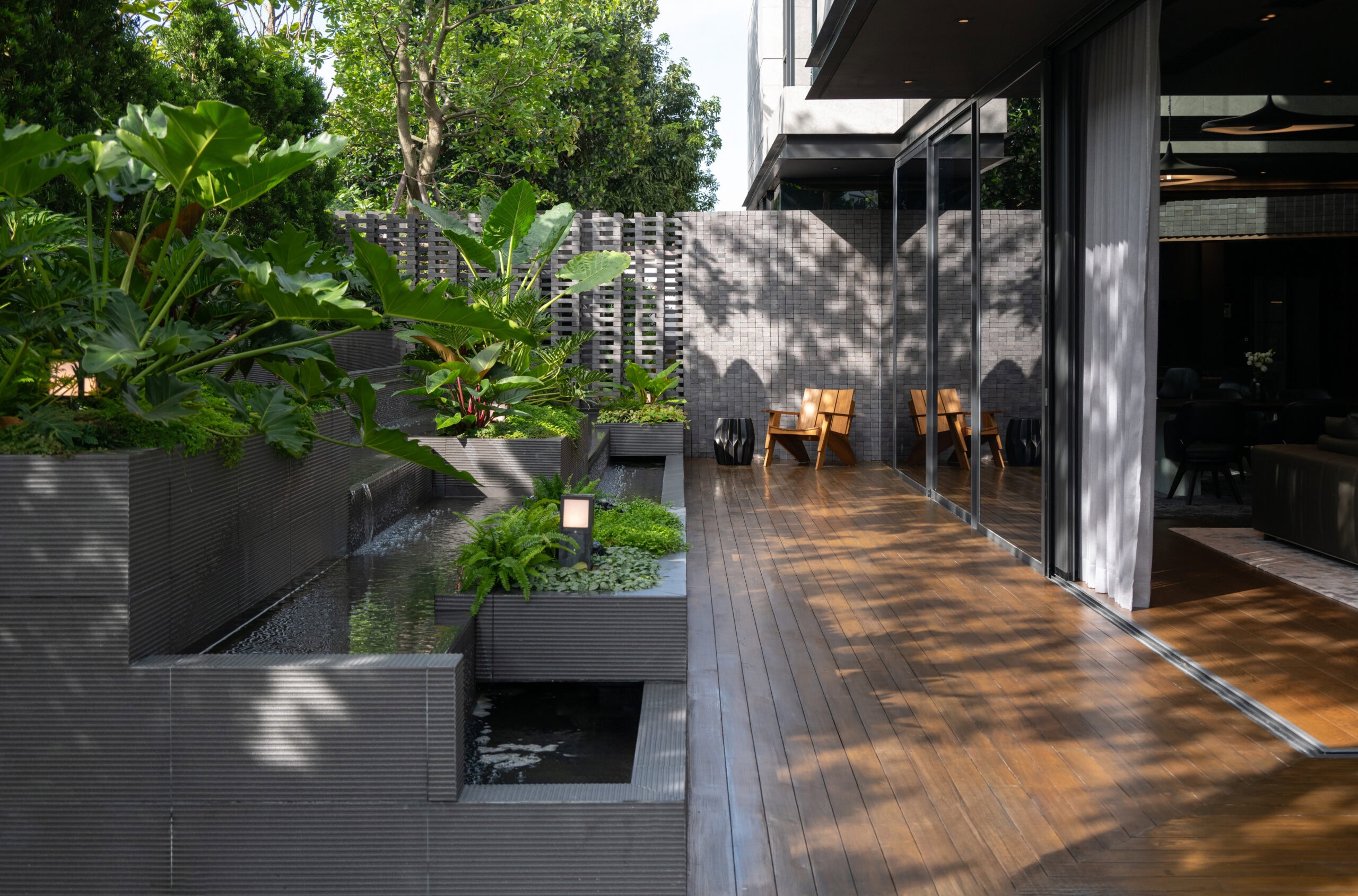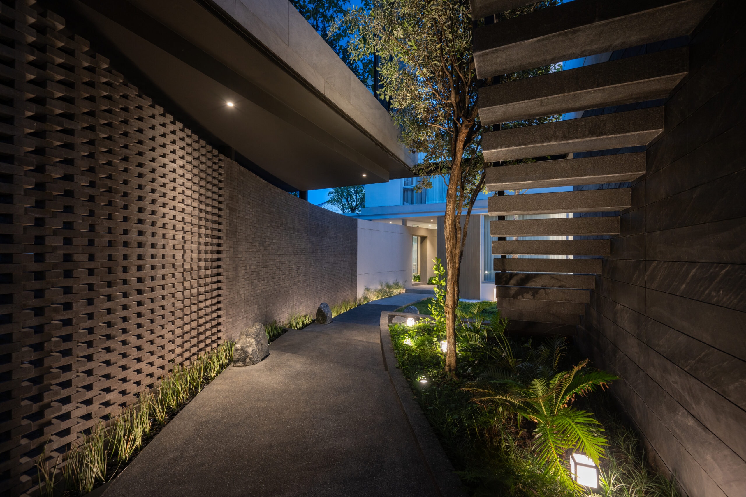 The curved wall not only creates a shared space but simultaneously acts as a buffer that defines privacy. The zones behind the curve were designated as private areas—bathrooms, kitchens, workspaces, and service rooms—interwoven with courtyards that function as shafts of wind and indirect daylight. These courtyards breathe air and light into the core of the homes, allowing residents to experience a sense of openness, as if flanked by gardens on both sides.The rear side of both houses borders a canal, requiring a minimum setback of six meters. This setback zone is therefore designed as an occupiable landscape area. One house incorporates a swimming pool, while the other features an infinity-edge stepping pond that evokes a natural waterfall. Both elements help generate cooling breezes from the south, where the buildings are directly exposed to heat.