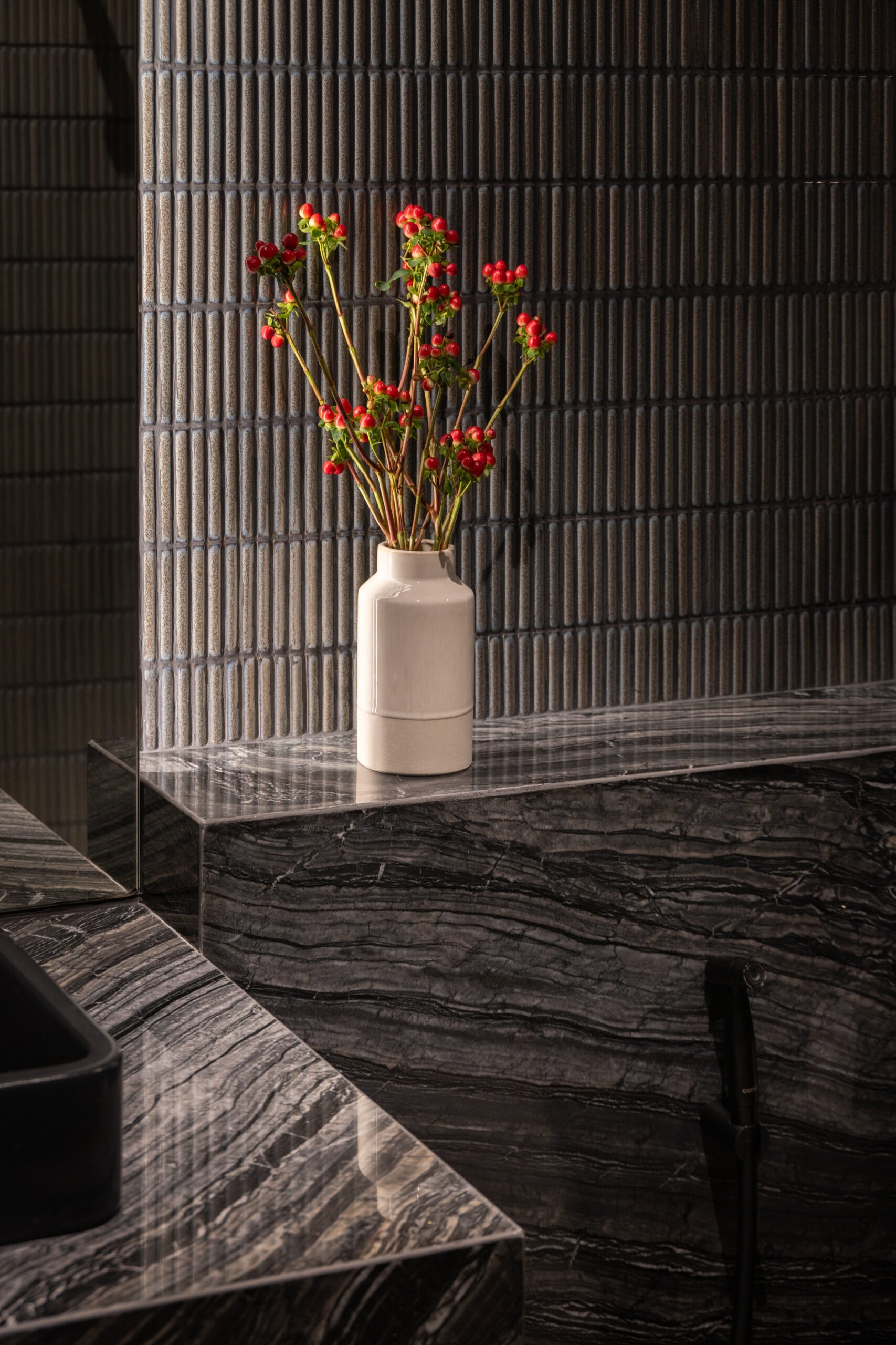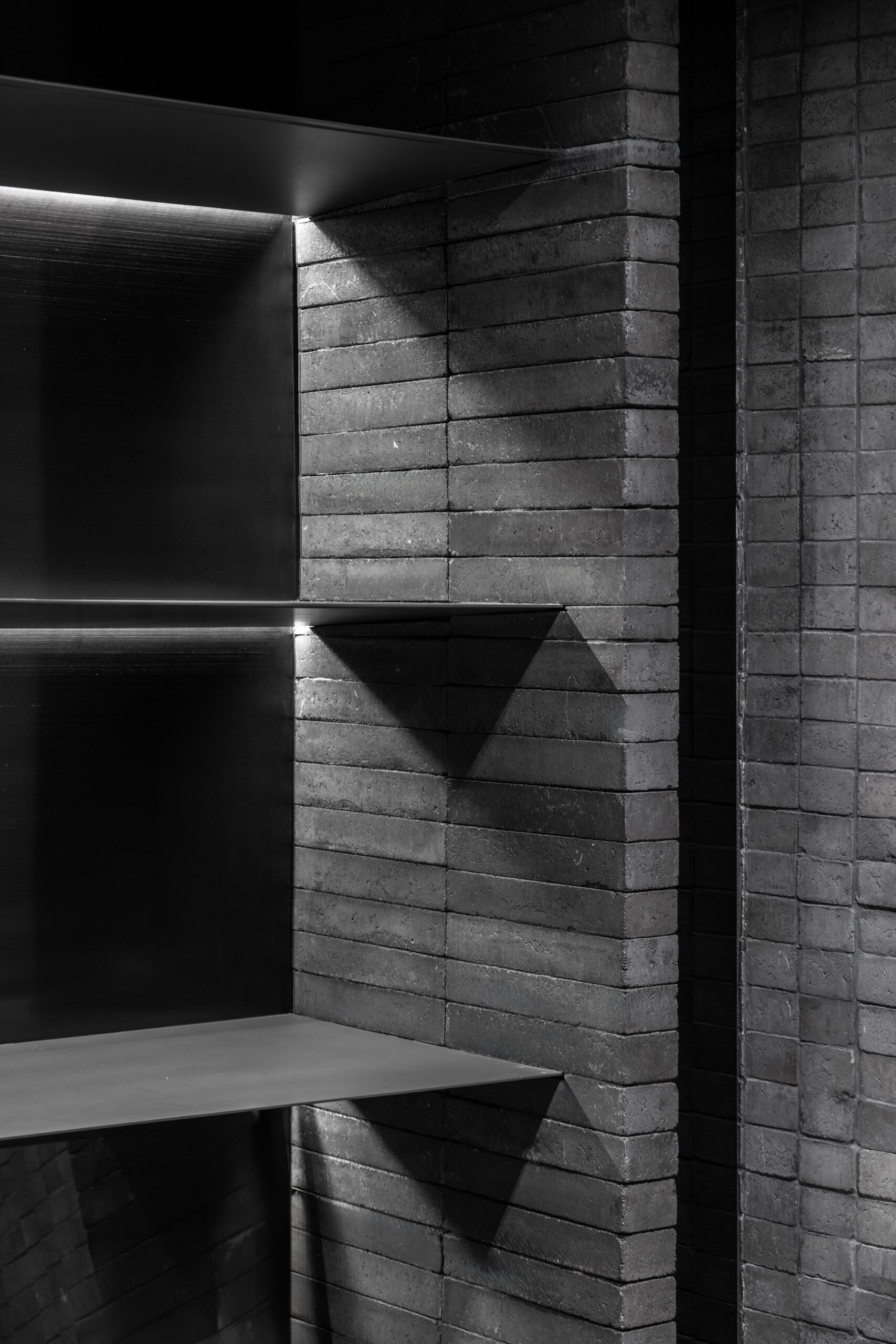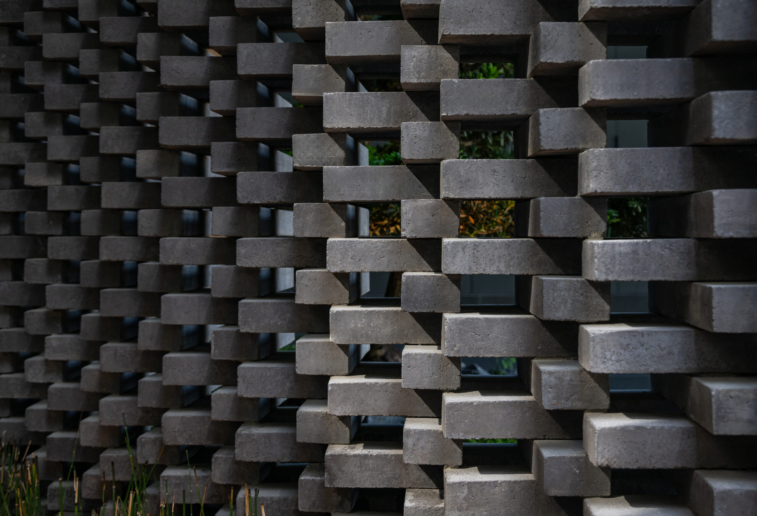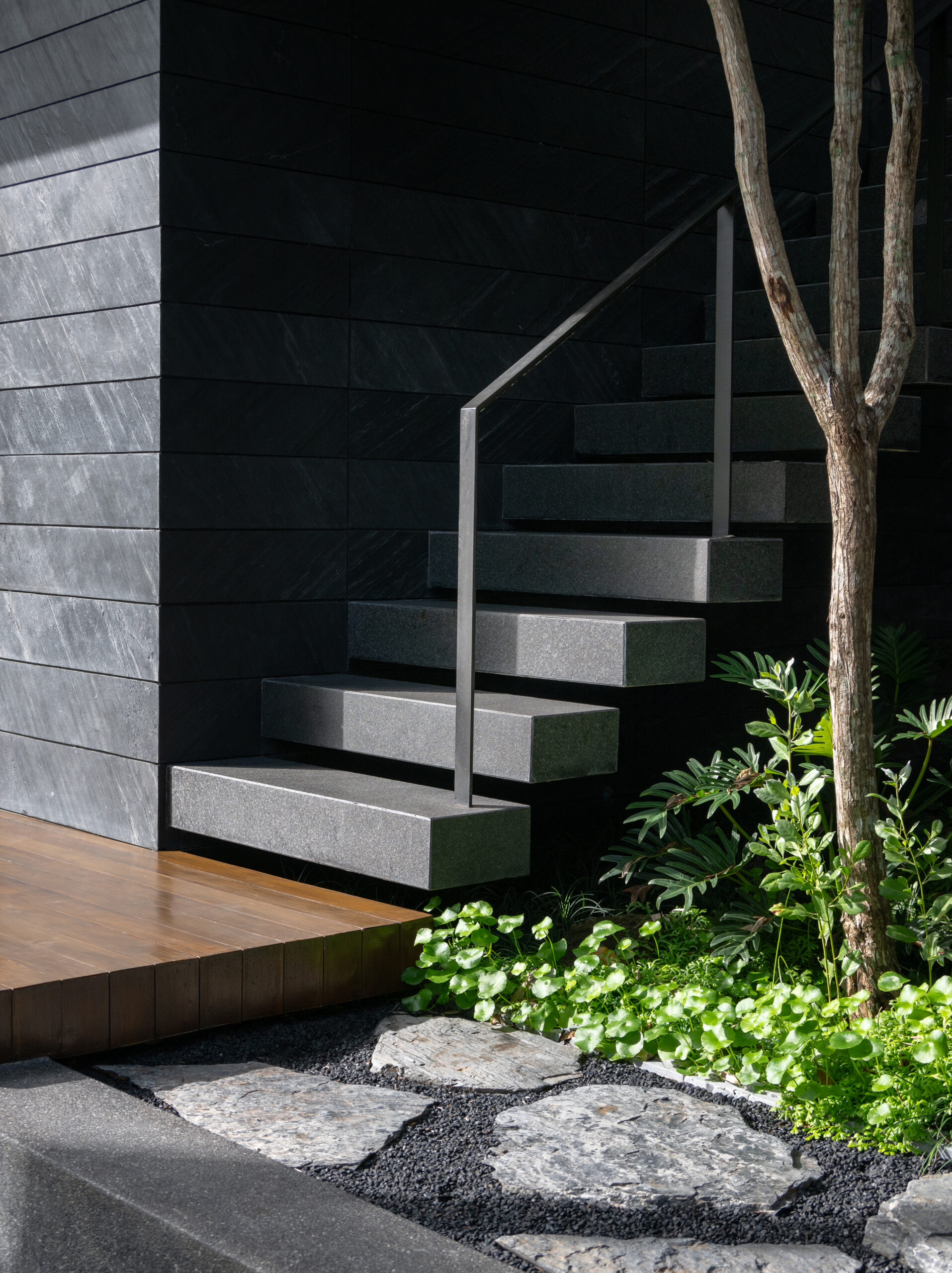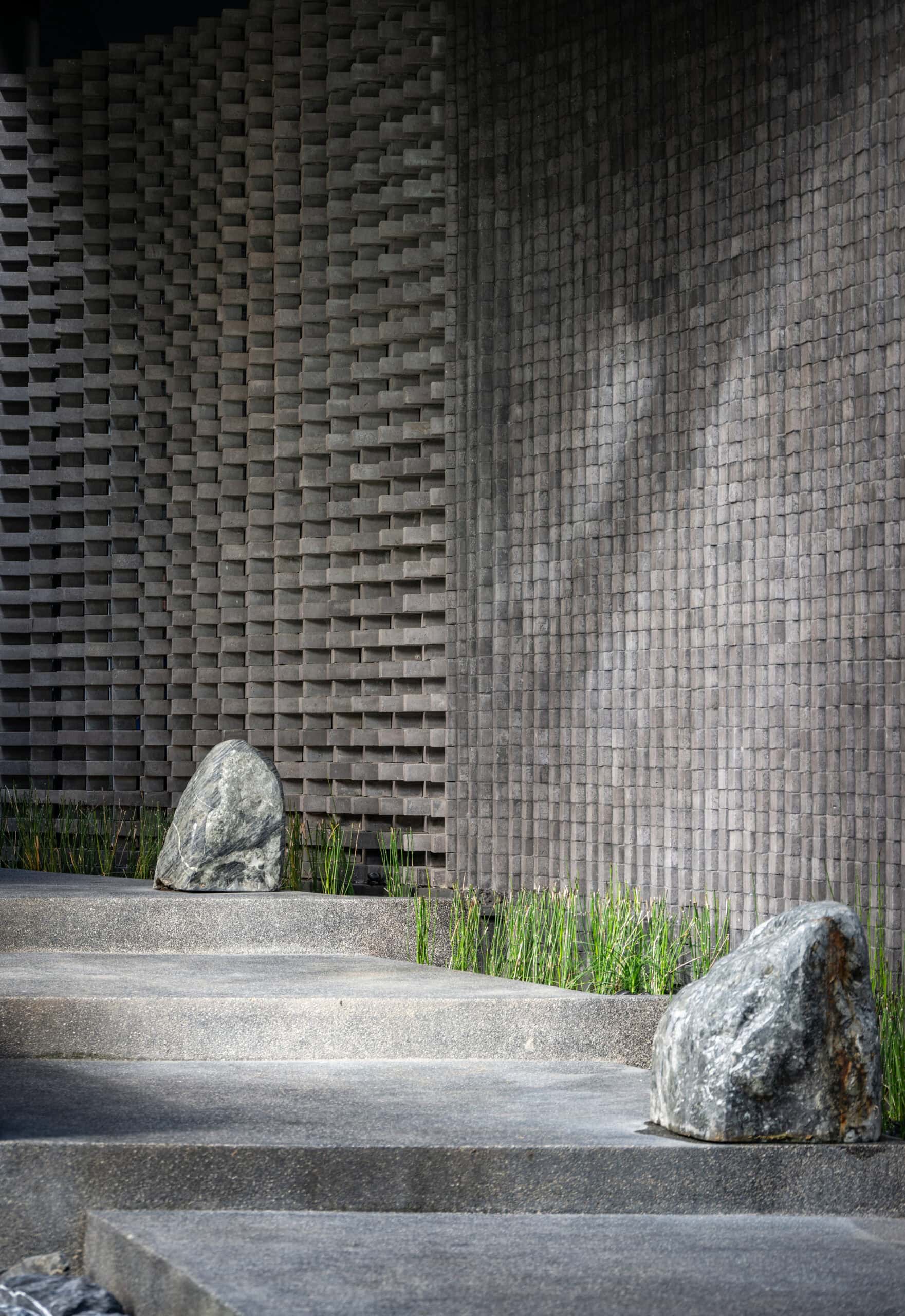 The curved wall not only creates a shared space but simultaneously acts as a buffer that defines privacy. The zones behind the curve were designated as private areas—bathrooms, kitchens, workspaces, and service rooms—interwoven with courtyards that function as shafts of wind and indirect daylight. These courtyards breathe air and light into the core of the homes, allowing residents to experience a sense of openness, as if flanked by gardens on both sides.The rear side of both houses borders a canal, requiring a minimum setback of six meters. This setback zone is therefore designed as an occupiable landscape area. One house incorporates a swimming pool, while the other features an infinity-edge stepping pond that evokes a natural waterfall. Both elements help generate cooling breezes from the south, where the buildings are directly exposed to heat.